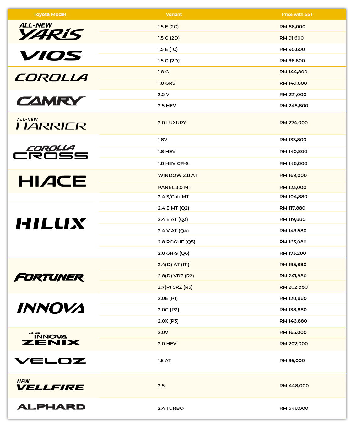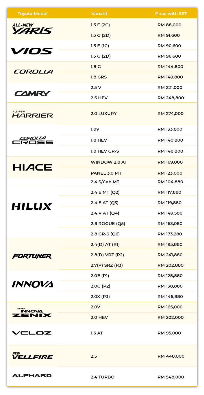 LATEST TOYOTA PRICE LISTS